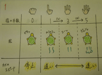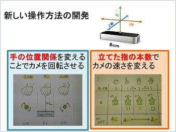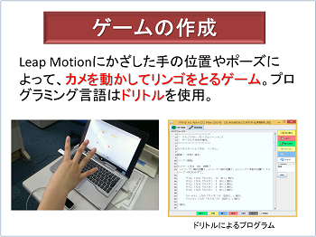 手・指操作でカメを動かしリンゴを捕るというリープのゲームでは、日本語入力できるプログラミング言語「ドリトル」を使用していることを知り、ゲームの新しい操作法を開発しました!