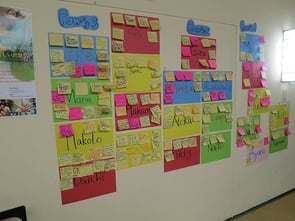 初対面の人達がお互いを認め合う仕掛けとして、「HappyNotes」があります。全員が集まって活動する大きな部屋の壁に貼られたそれぞれのメンバーの名前のカードに、「その人がステキだと思ったこと」や「○○してくれてありがとう」などのメッセージを書いて貼り付けていくのです。なかなか自分から前に出られない人に対しては、スタッフの高校生達がメッセージを書いてあげるなどして、お互いのいいところを知り合う機会になっていました。プログラムが進むにつれて、カードはどんどん増えていき、中学生は他者から認められることを通して自信を深めることができます。