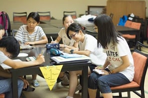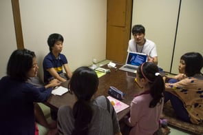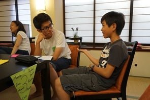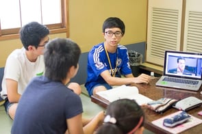 サマースクールの中で考えたこと、感じたことをしっかりと自分のものとするために、毎晩中学生、高校生、大学生の小さいグループでその日の復習を行います。自分が感じたことを話すことによって、意見や考え方を共有したり、他の人との違いに気づいたりする経験を深めます。