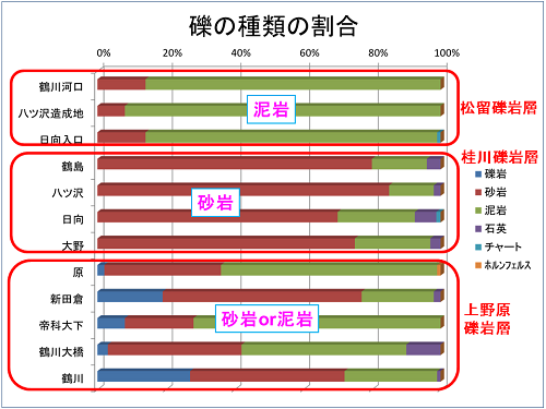 礫の種類は、以下のグラフから、泥岩主体の地域と、砂岩主体の地域と、砂岩と泥岩主体の地域の3グループに分けられることがわかりました。それぞれを、松留礫岩層、桂川礫岩層、上野原礫岩層としました。
