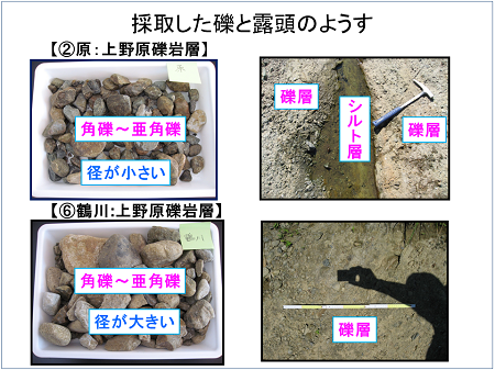 採取した礫と露頭の状態はスライドの通りです。鶴川流域の原と鶴川の写真です。原から鶴川では、礫は角礫から亜角礫で、地層では礫層の中に砂層やシルト層も見られました。八ツ沢と日向入口では、地層は礫層のみで、礫は円磨度の高い円礫でした。