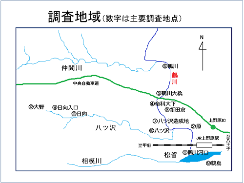 この鶴川流域で6ヶ所、その他の地域で6ヶ所の、計12か所で調査を行いました。調査地域は地図の1~12です。