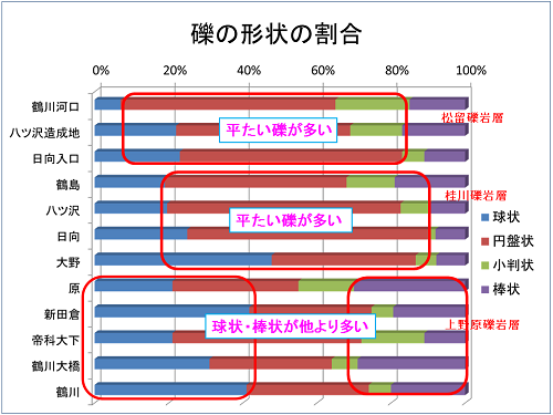 このグループをもとに礫の形状を見てみると、松留礫岩層では円盤状の礫が最も多く、桂川礫岩層では円盤状の礫が最も多い地域が多く、次が球状でしたが、大野ではその逆でした。上野原礫岩層は、棒状や球状の礫が比較的多く見られました。