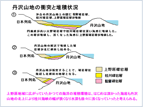 文献によると、上野原礫岩層は新第三紀鮮新世の500万年前に堆積したものであり、丹沢山地と列島の衝突と時代が一致することからも、当時の海は浅かったことがわかります。
