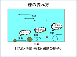 礫の流れ方には、河床を引きずられるように流れる滑動、転がるように流れる転動、跳ねるように流れる跳動があります。