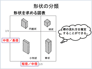 礫の形状は、長径・中径・短径の長さの関係から、円盤状・球状・棒状・小判状に分類しました。礫の形状からは、礫の流れ方を推定することができます。