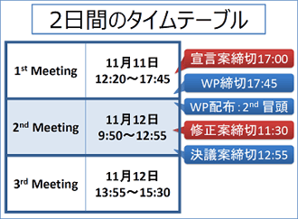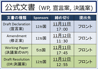 1日目の第1回ミーティングの終了時に、論点1についての宣言案(DD)を提出します。宣言案には12か国以上の提案国(スポンサー)が必要です。また、決議案(DR)策定に向けた、5か国以上のスポンサーによるワーキングペーパー(WP)の提出も認められます。