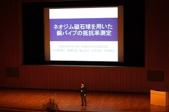 この研究発表は、磁石球間に働く磁気力を自作の磁気力測定器を作り、高い精度で測定することに成功した物理系の研究が、探究心に溢れていると評価されました。