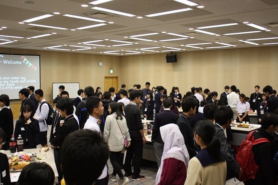 つくばサイエンスエッジ2018の初日の夕方、台湾、タイ、フィリピン、インドネシア、ミャンマー、香港と日本の中高生約110名が集い、国際交流会が開かれました。順天高校、広尾学園高校の生徒が国際交流会の立案と進行を行い、ゲームをしながら親交を深めました。