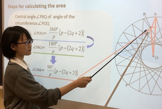 実は、手の爪に塗られた星のマニキュアを見て、爪の中に一体、どのぐらい大きな星型が描けるだろうかという疑問を抱いたのがきっかけです。円に内接する星の図をイメージし、そこから星型の面積の求め方に着目し、今回の研究を始めました。