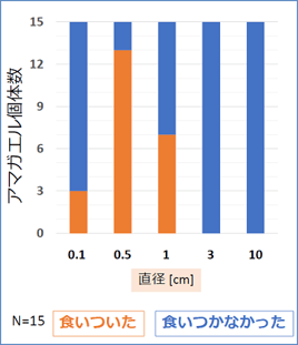 直径10センチから0.1センチまでの5つの大きさの図形をアマガエルに提示し、採餌行動を観察しました。アマガエルは、直径0.5センチではひんぱん採餌行動をとりますが、直径3センチではまったく行動しませんでした。