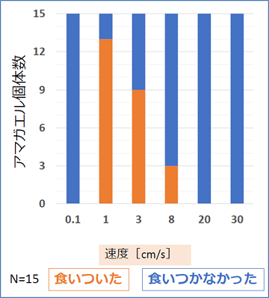 秒速30センチから秒速0.1センチまでの6段階の速度で図形を連続して提示した結果、秒速1センチのとき最も採餌行動をとりやすく、速度が上がれば上がるほど採餌行動をとらなくなるという結果が得られました。