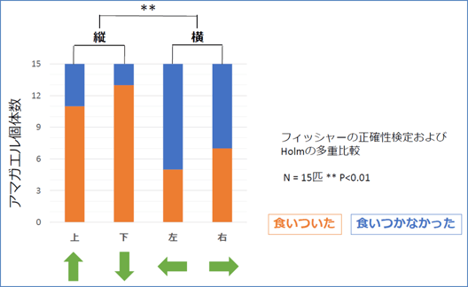 物体の進行方向を変えて、反応を見ました。すると、アマガエルは上下方向、すなわち縦方向に動くエサに対して、採餌行動をとりやすいという傾向が見られました。