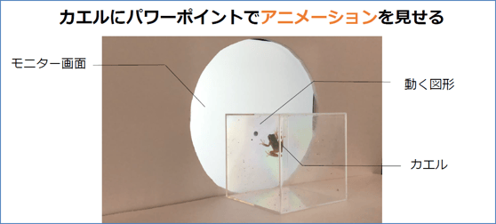 飼育していたアマガエルが食べやすい餌、食べにくい餌の種類があることに興味を持ち、どのような視覚条件がカエルの採餌行動に影響を与えているのか、実験しました。パワーポイントのアニメーション機能を使って、アマガエルの目の前で図形を動かすという新しい実験方法で行いました。