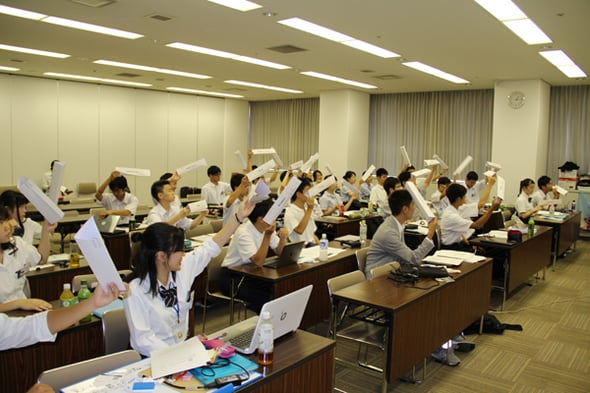 参加者には事前にプロシージャ(会議進行上のルール)は配られていますが、議事に夢中になって議場全体が落ち着かない雰囲気になったときには、フロントが「(残りの時間から考えて)今、何をしなければならないか、考えてみよう」と声をかけたり、スピーチの有効な使い方をアドバイスしたりしてくれます。そのため、初心者にも会議行動の注意点がわかりやすくなっていました。