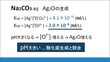 溶解度積を比較すると、酸化銀の方が炭酸銀よりも小さいため、沈殿が生じやすいことがわかります。またpHが大きくなるとO2-の濃度が上昇するので、酸化銀が増加すると考えられ、塩基性条件下では酸化銀生成と炭酸銀生成が競合するといえます。