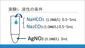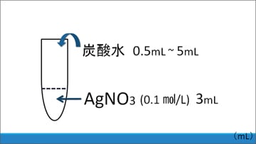 これらを、それぞれ0.5から5.0 mLまで0.5 mLずつ増やしながらAgNO3水溶液に加えていき、沈殿の生成を観察しました。