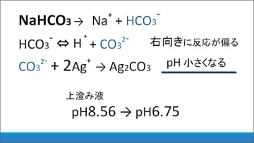 炭酸銀が生成するとCO32-が減るために、HCO3-(炭酸水素塩)が電離してH+とCO32-が生じる可逆反応の平衡が右に移動します。その結果、pHが小さくなると推測できます。