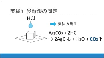 白色沈殿物が炭酸銀であるかを確認するため、白色沈殿に塩酸を滴下した様子を観察しました。その結果、気体の発生が見られました。