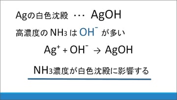 ・炭酸銀という白色沈殿が生じる原因に、一見関係がなさそうなアンモニア水がpH調整に大きく関わっていること