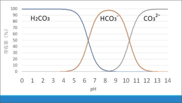 pHと、水溶液中の炭酸、炭酸水素イオン、炭酸イオンの存在率の関係を示すグラフを確認します。すると、pHが8より大きいときに炭酸イオンが存在していることがわかります。