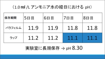 結果、(1)のパラフィルムで覆った場合は8日目に至るまで大きなpHの変化もなく、白色沈殿も生じませんでしたが、(2)の市販ラップで覆った場合は7日目でpHが11.1になり、白色沈殿が生じました。また、実験室で長期保存したNH3水のpHは8.30でした。