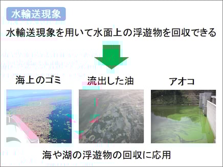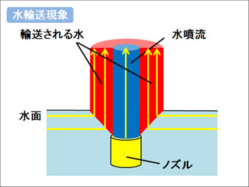 この「水の噴流によって水面の水や浮遊物が輸送される」という現象を、私たちは「水輸送現象」と名付け、研究を重ねてきました。