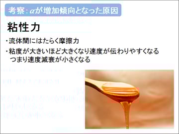 私たちが考えたのは、「水以外の液体を使えば、αの値も変わるのではないか」ということです。そこで私たちは「粘性」に注目しました。