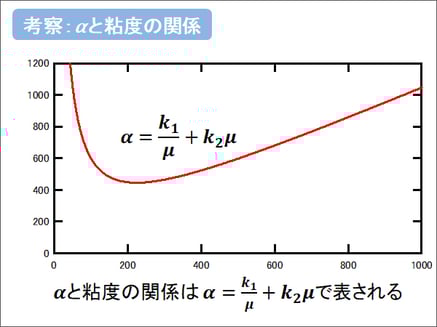 μが大きいときには粘性力の効果が、μが小さいときには水流の乱れの効果が大きくなります。つまり、水噴流定数αは、下図のようにμに比例する量と反比例する量の足し算として表せると結論付けました。