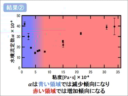 液体と液体の間の、粘性力の働きやすさを「粘性」と呼びます。そこで私たちは、様々な粘性の液体を用いて実験を行い、粘性と水噴流定数αの間の関係を探ることにしました。