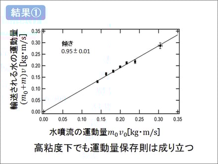 横軸にホースの水の運動量、縦軸に水面から飛び出す水の運動量をとると、直線に近いグラフが得られ、両者がほぼ一致していることがわかります。