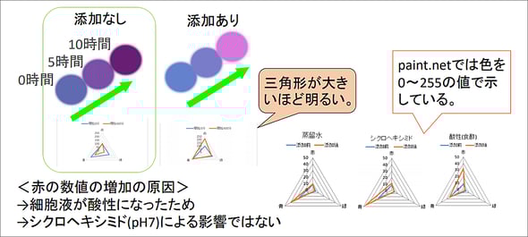しかし、シクロヘキシミドを添加したアサガオは、赤の数値が大幅に増加してしまいました。これは細胞液が酸性になったために、アントシアニン色素がより赤くなったことが原因です。シクロヘキシミドは中性なので、シクロヘキシミドそのものの影響ではないことがわかりました。