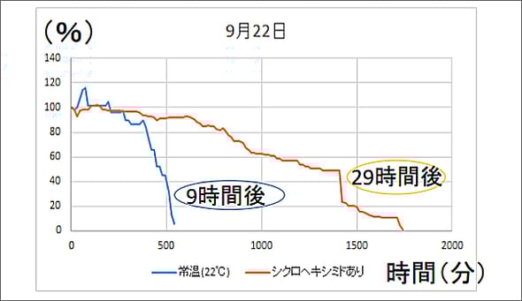 常温のアサガオは9時間後にしぼんだのに対し、シクロヘキシミドを添加したアサガオは29時間後にしぼんだということで、大幅に花の大きさが保たれているといえます。