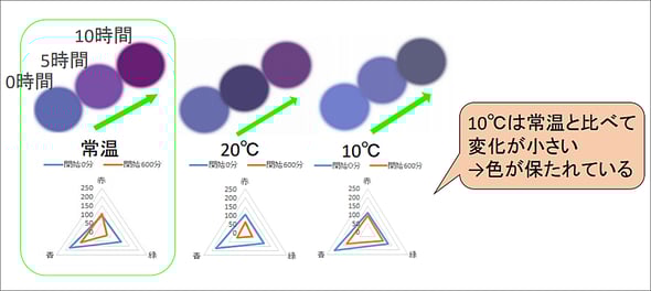 さらに10℃に低温処理したアサガオの色の三要素のグラフの三角形はほとんど形が変わっていないために、低温処理はアサガオの花の色の維持に有効であることがわかりました。