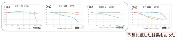 次に低温処理の影響を調べました。外気温で開花させたアサガオを、20℃または10℃の低温状態に移して比較しました。グラフの横軸が経過時間、縦軸がもとの花に対する大きさの割合です。