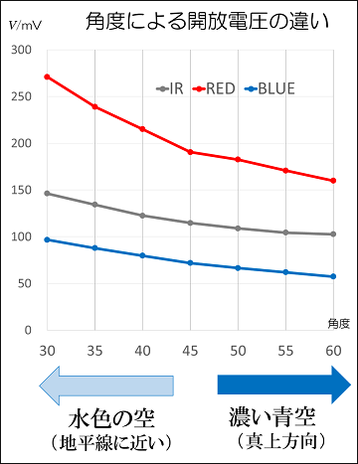その結果、私たちが予想した通り、白みが強い空の方が青みの強い空よりも、開放電圧が大きいことがわかりました。