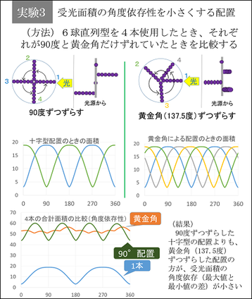 90度ずつずらして配置したものと、黄金角(137.5度)ずつずらして配置したものを比較すると、黄金角で配置したもののほうが安定して受光できていることがわかりました。黄金角は針葉樹の配置に近い角度です。