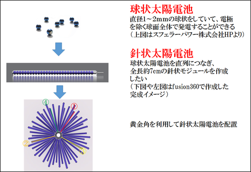 針葉樹が効率的に光合成をするのは、針のような葉の形状がポイントとなっています。そこで球状太陽光電池を針状につないだ太陽光電池を提案します。
