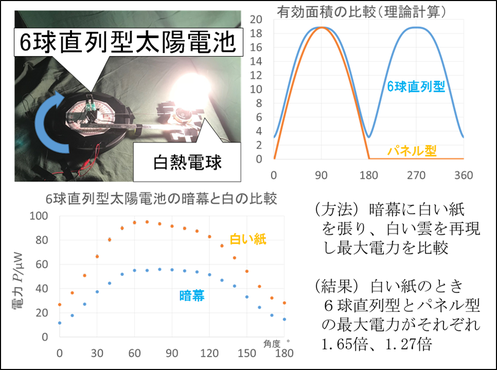 また、太陽が動くことをイメージして角度依存性についても調べました。受光面積の理論値と電力の測定値の間に関連性が見られました。光の当たる角度が180度を超えると、パネル型ではまったく受光できなくなりますが、6球直列型の場合は反射した光が裏から当たっても受光でき、角度によってゼロになることはありません。