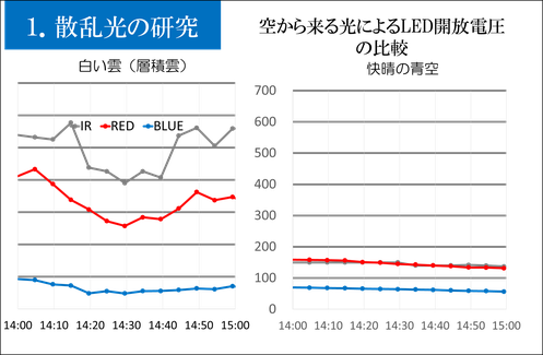 1. レイリー散乱(※1)が起こっているため、青い空から来る散乱光は、雨雲や白い雲を通してくる光より、青色LEDに生じる開放電圧が大きい。