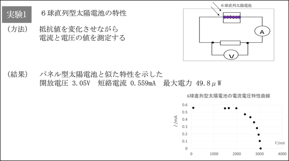 まず、抵抗値を変化させながら電流と電圧の値を測定しました。すると、電流と電圧についてはパネル型太陽電池と似た特性を示しました。