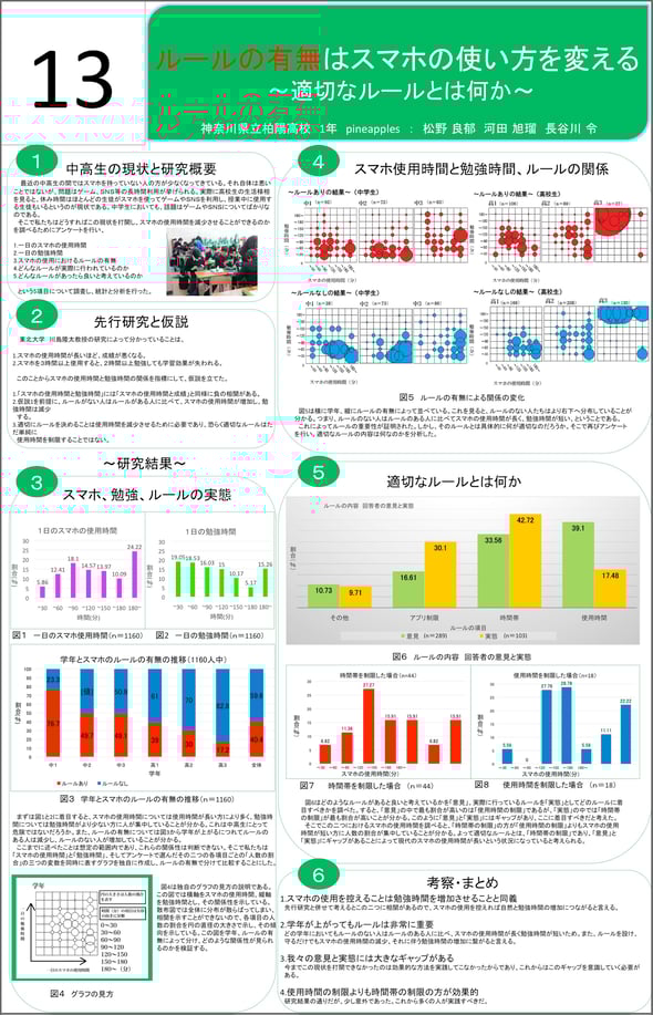1160人にアンケートを行った結果、ルールがある人の割合は学年が上がるにつれて減少することがわかりました。そして、スマホの使用時間と勉強時間の関係としては、ルールがある人に比べてルールのない人はスマホの使用時間が長く、勉強時間が短い傾向にあることがわかりました。つまり、学年が上がるにつれてルールの重要性も上がるということです。