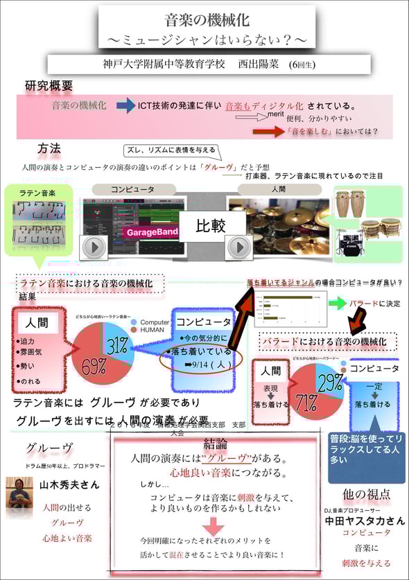 まずこの研究は、完全オリジナルという点で自分らしい研究であり、コンピュータだけでなく音楽の面においても研究しているところを工夫しました。そして、ラテン音楽の結果から、さらに少数派の部分に注目して実験を深めることを工夫しました。