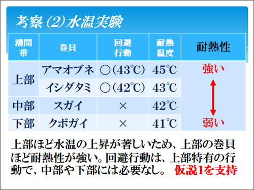 水温実験からは、潮間帯上部のアマオブネとイシダタミは、潮間帯中部や下部のスガイやクボガイよりも高温に耐えたことから、仮説1.を支持する結果が得られました。