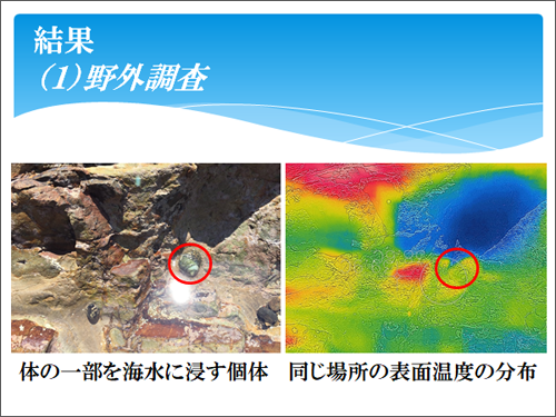 野外調査からは、日光を遮るものがない潮だまりで、水温40℃でも耐えていたことから、一定の熱耐性を持っていることがわかりました。また、水温上昇に伴い、海水中から這い出し、海水に体の一部を浸しておくことで、体温上昇を抑えていると考えられます。