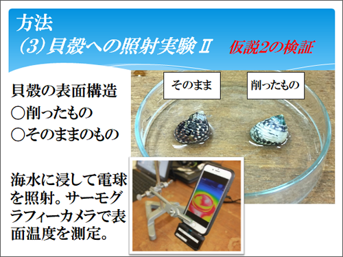 電球を貝殻に照射して温度上昇を調べる実験には先行実験がありますが、その貝殻の蒸発熱の利用について調べるために海水の入ったシャーレに貝殻をのせて照射実験をしたことが工夫した点です(羽方くん)。