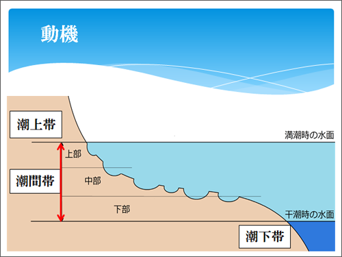 また、海水に沈んだり干上がったりする潮間帯でも、上部と下部では水没している時間が異なるため、生息する巻貝の種類も異なります。