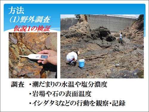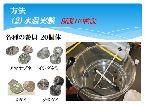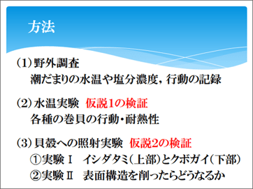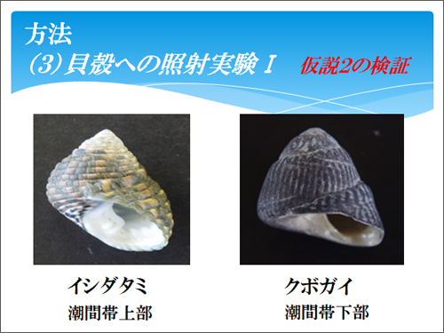 仮説を検証するために、(1)野外調査 (2)水温実験(仮説1.の検証)(3)貝殻への照射実験(仮説2.の検証)を行いました。