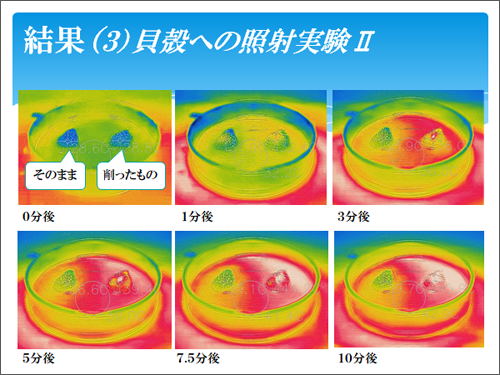 サーモグラフィで見ると、貝殻を削らずそのままの方が、色の変化が緩やかなのに対して、削ったものの方は急激に色が変化していくのがわかります。つまり、削ってしまうと、急激な温度上昇が起こるということです。