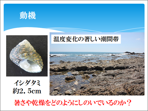 科学部では、数年前からイシダタミの研究を行っていました。今回も継続して研究しようと考え、生息している場所に注目しました。イシダタミは、日差しが強く熱い場所でも生息しているので、どのように暑さ対策をしているのか、興味を持ちました。この巻貝の名前の由来ともなった石畳状の構造が関係しているのではないかと考え、研究を始めました(羽方くん)。